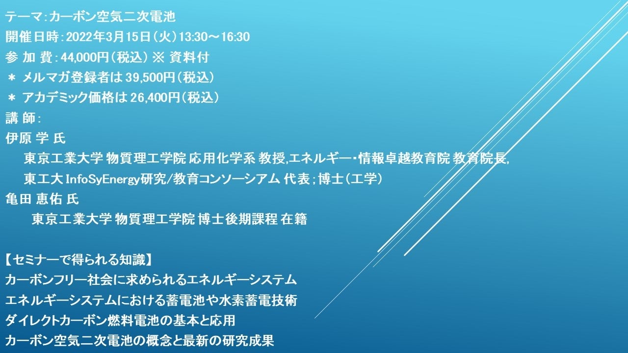 先端技術情報や市場情報を提供している(株)シーエムシー・リサーチ(千代田区神田錦町: https://cmcre.com/ )では、 各種材料・化学品などの市場動向・技術動向のセミナーや書籍発行を行っておりますが、 このたび「カーボン空気二次電池」と題するセミナーを、 講師に伊原 学 氏 (東京工業大学 物質理工学院 応用化学系 教授,エネルギー・情報卓越教育院 教育院長,東工大 InfoSyEnergy研究/教育コンソーシアム 代表;博士(工学))と亀田 恵佑 氏(東京工業大学 物質理工学院 博士後期課程 在籍)をお迎えし、2022年3月15日(火)13:30より、 ZOOMを利用したライブ配信で開催いたします。 受講料は、 一般:44,000円(税込)、 弊社メルマガ会員:39,500円(税込)、 アカデミック価格は26,400円(税込)となっております(資料付)。