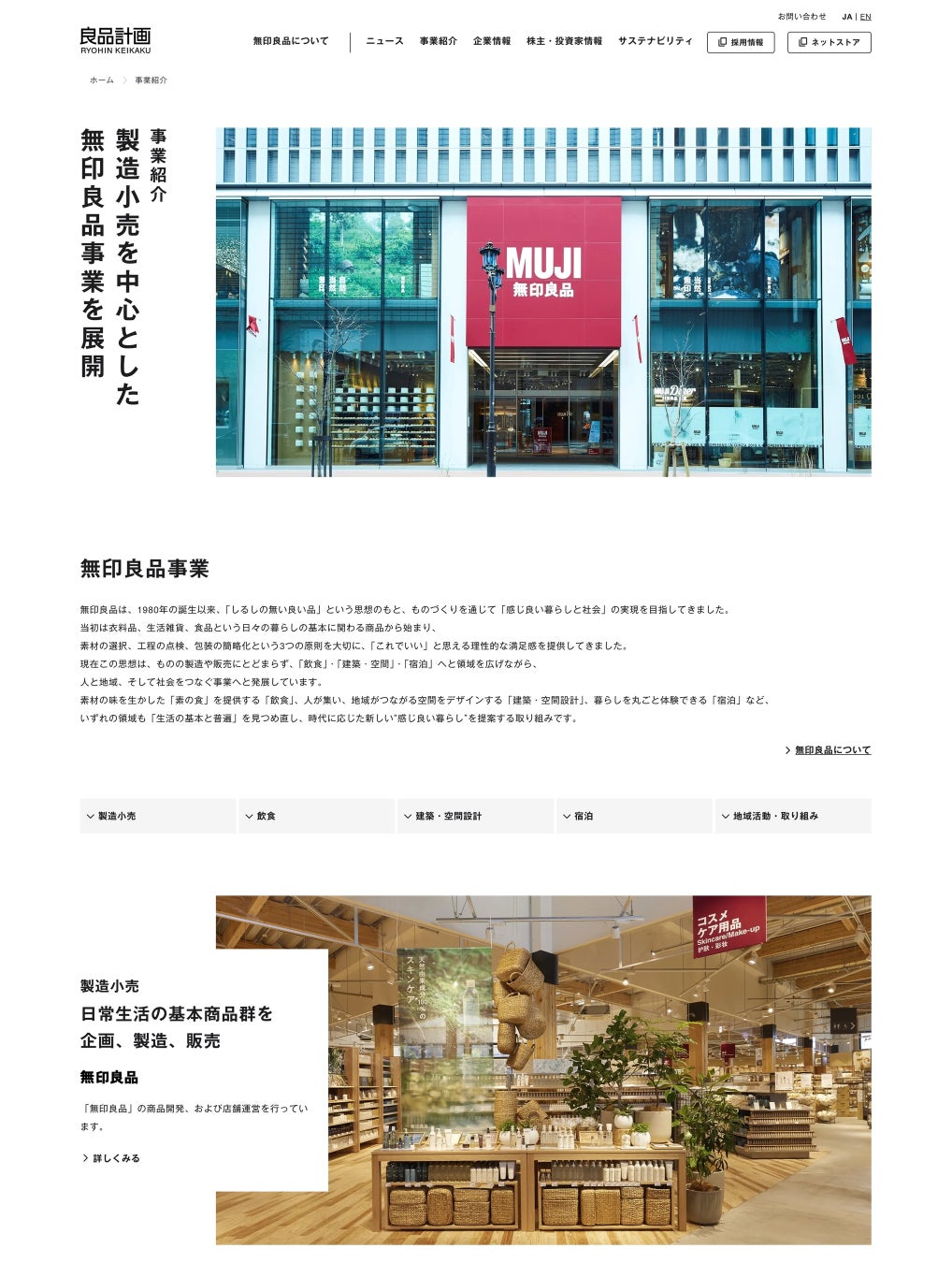 2021年に掲げた「第二創業」以降、良品計画の事業や活動が多様化していることを踏まえ、新たに「事業紹介」ページを設け、領域別に紹介しています。