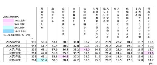 アルバイトの目的は「交際費のため」が6.0pt増加。低学年層ほどキャリア形成を目的とする傾向も【図1、2】