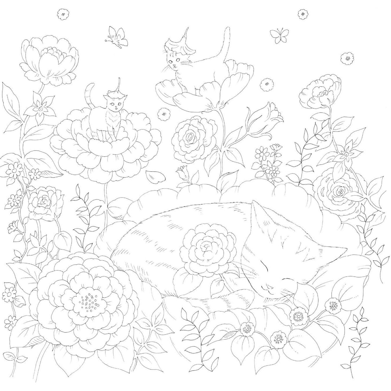 カワイイ猫の表情と美しい花に満ち溢れた究極の癒しのぬり絵ブック。