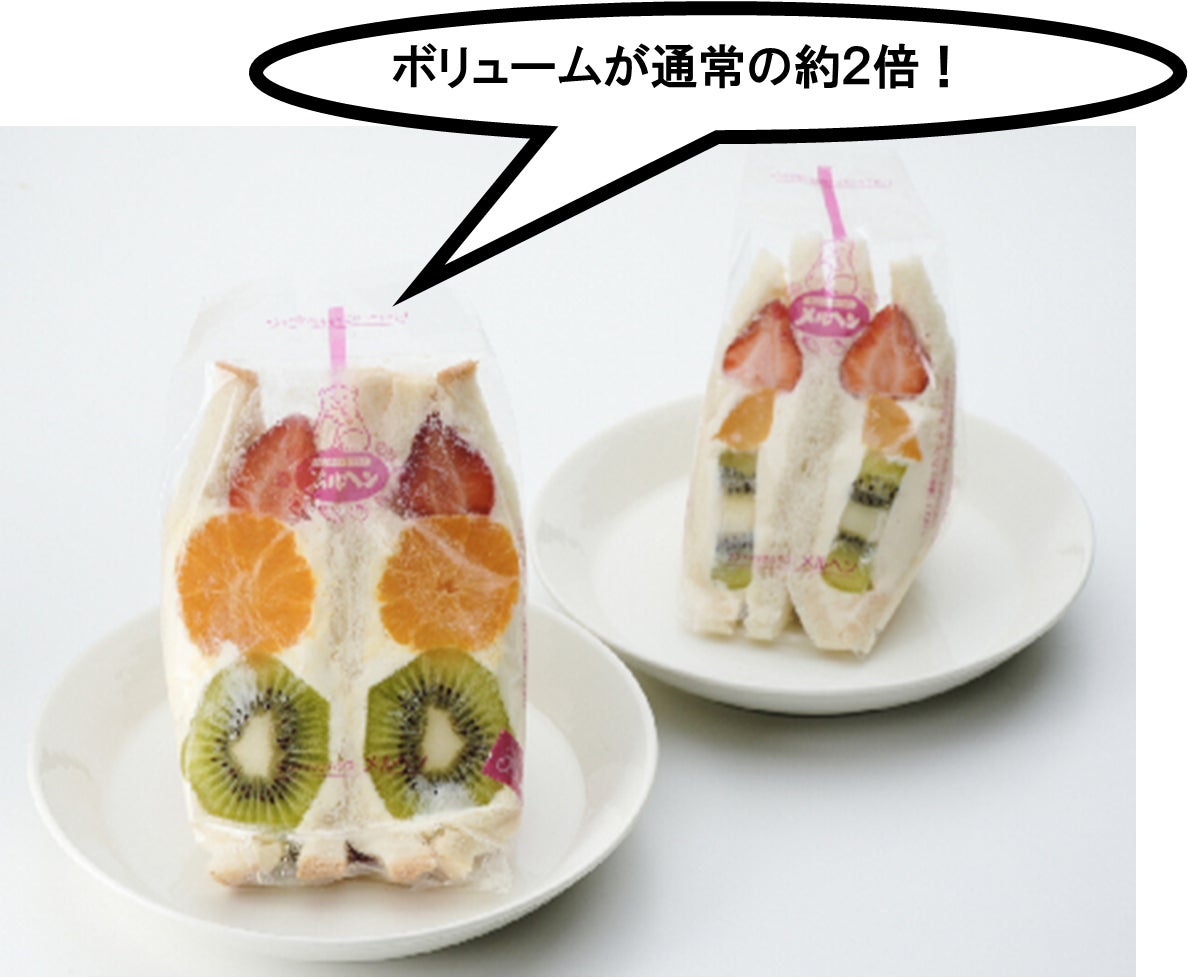 〈メルヘン〉左)苺、まるごとみかん、キウイとたっぷりの生クリームが入った極厚のフルーツサンド!極厚フルーツサンドスペシャル 864円 ※各日予定数4個、右)通常サイズのフルーツサンド!フルーツスペシャル 604円