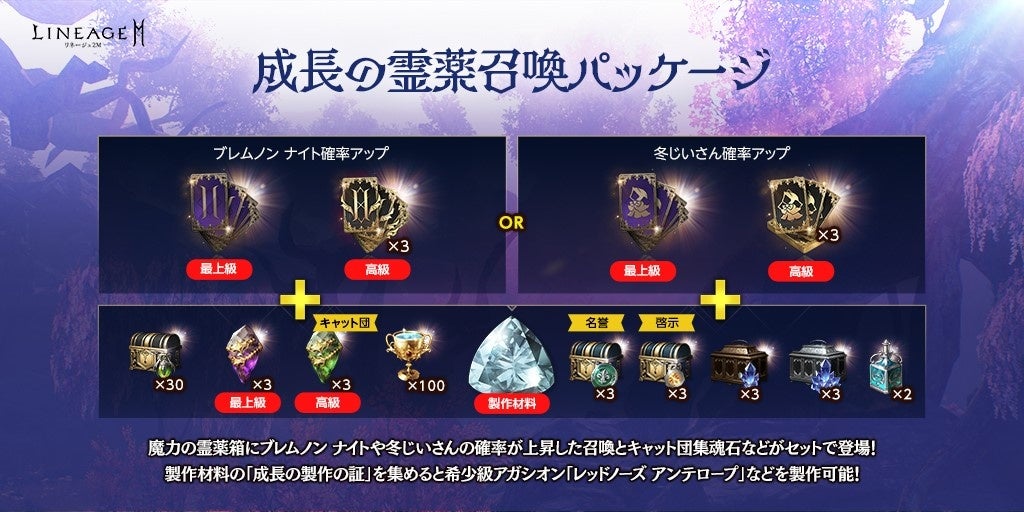 クラス、またはアガシオンの召喚44回分に、「魔力の霊薬箱」30個と「魔力の最上級集魂石(11回)(刻印)」3個などがセットになった、「成長の霊薬召喚パッケージ」が登場しました。