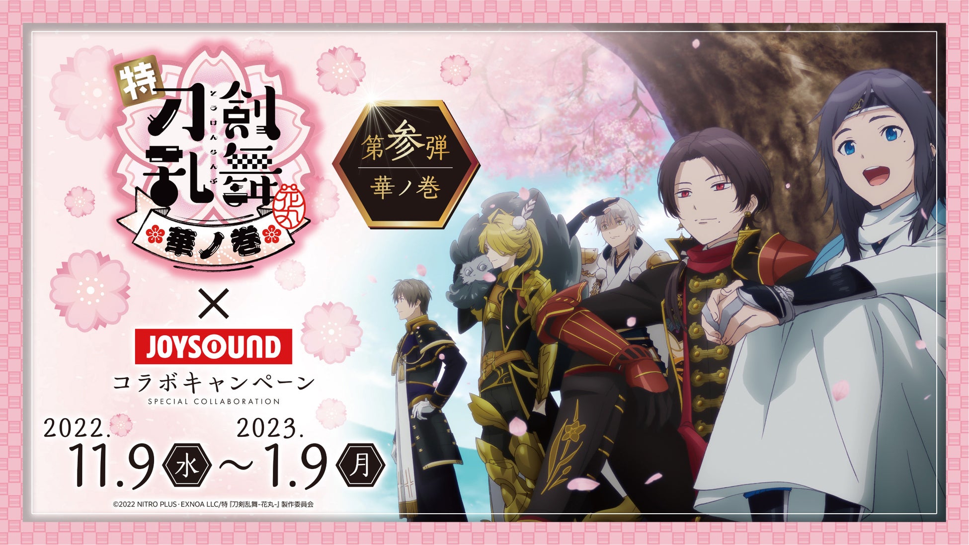 株式会社エクシングの子会社で、全国にカラオケ店舗を展開する株式会社スタンダード(本社:東京都港区、代表取締役社長:米田洋一)は、2022年11月9日(水)から2023年1月9日(月)までの期間中、「特『刀剣乱舞-花丸-』〜雪月華〜」×JOYSOUND直営店コラボキャンペーン第参弾と題して、JOYSOUND仙台一番町店(宮城)・JOYSOUND名駅二丁目店(愛知)・JOYSOUNDなんば戎橋店(大阪)・JOYSOUND博多口駅前店(福岡)にカラオケコラボルームをオープンいたします。また、コラボルーム実施店舗を含む、全国のJOYSOUND直営店25店舗にて、「特『刀剣乱舞-花丸-』〜雪月華〜」オリジナルコースター付きコラボドリンクメニューを展開します。
