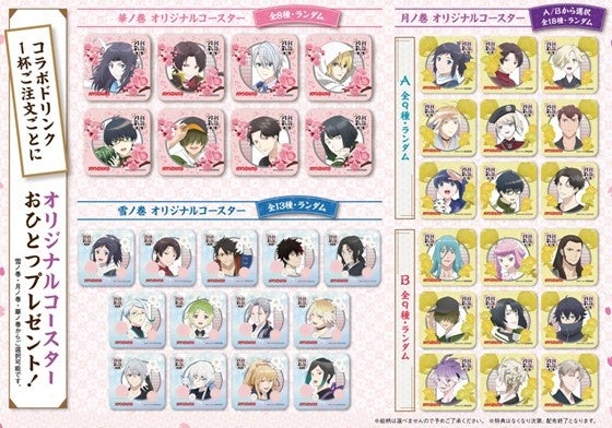 コラボドリンク1杯ご購入につき、オリジナルコースターを「雪ノ巻」、「月ノ巻<A>・月ノ巻<B>」、「華ノ巻」の4つのセットから、お好きなセットを1つご選択いただき、その中からランダムで1枚プレゼントします。