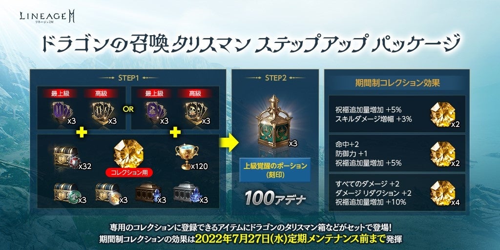 クラスまたはアガシオンの召喚66回分に、「ドラゴンのタリスマン箱(刻印)」32個と「ドラゴンの証(刻印)」1個などがセットになった「ドラゴンの召喚タリスマン ステップアップ パッケージ」が登場しました。