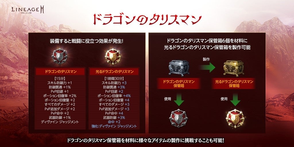 「ドラゴンのタリスマン」を使用して製作できるアイテムは週ごとに異なり、期間限定製作の1週目ラインナップには、伝説級防具「堕天使のヘルム」「堕天使のブレスト プレート」「堕天使のゲートル」「堕天使のグローブ」や、「ドラゴンの伝説級防具選択箱(刻印)」などをはじめとしたアイテムが登場します。
