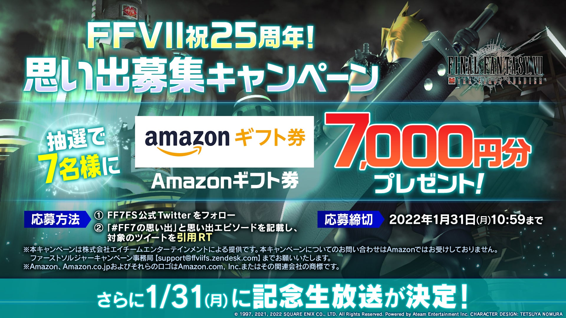 1月31日に25周年を迎える『FINAL FANTASY VII』の思い出を投稿すると、抽選で7名様にAmazonギフト券7,000円分が当たります。