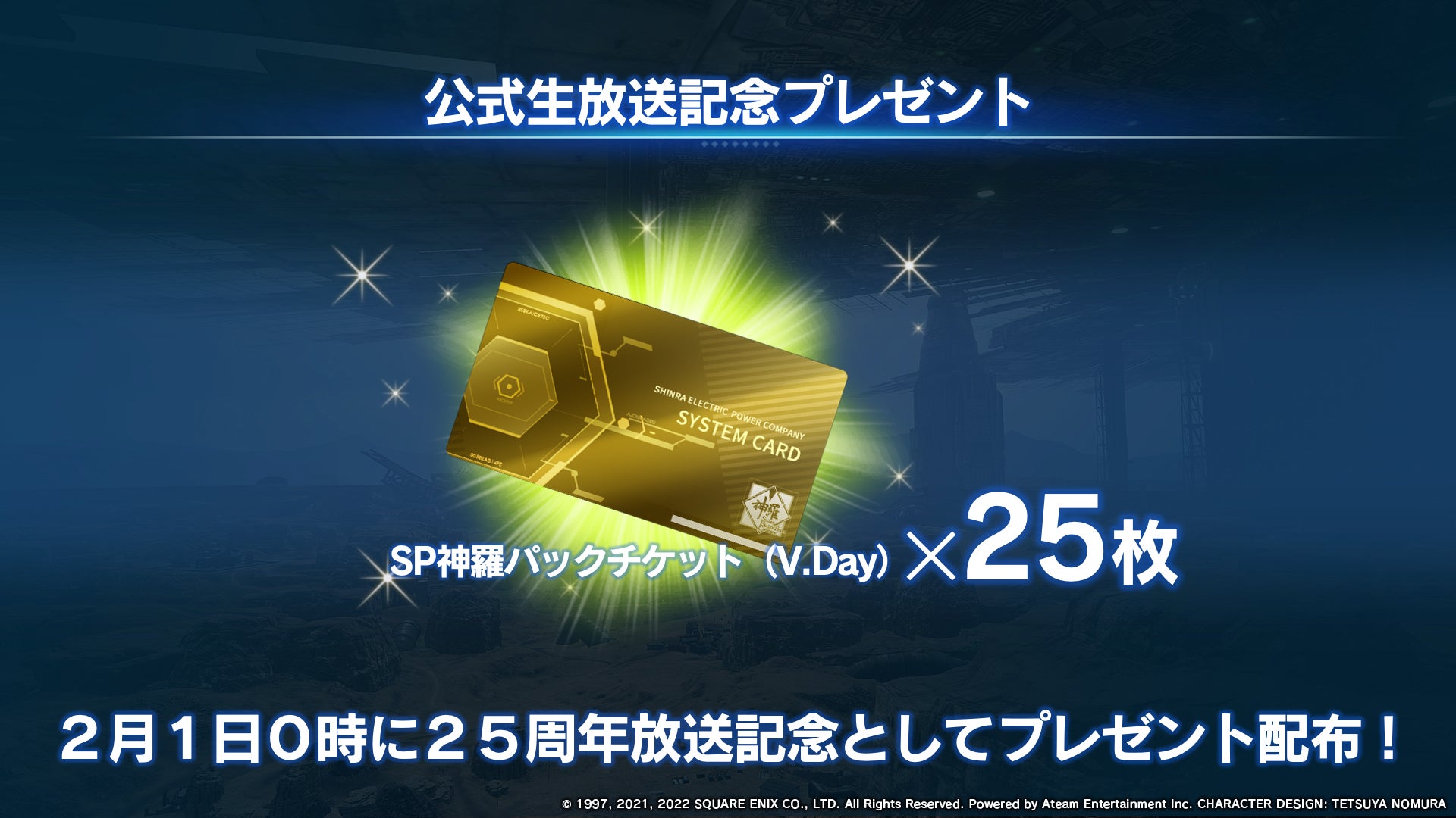2022年1月31日(月)の公式生放送「FINAL FANTASY VII 25th 記念配信」を記念して、「SP神羅パック(V.Day)」25枚をプレゼントします。