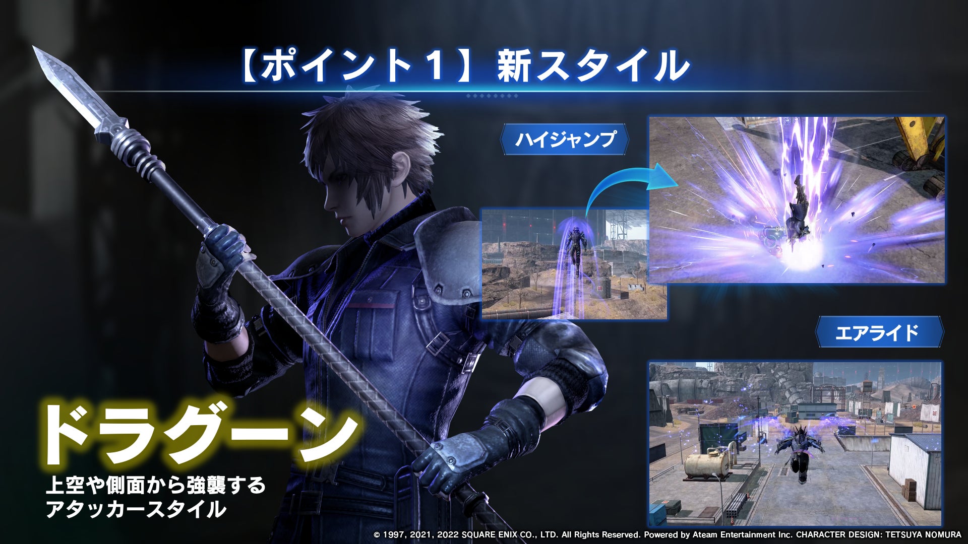 「ドラグーン」は、上空や側面から強襲するアタッカースタイルです。上空に高くジャンプするアビリティ「ハイジャンプ」や、空中を飛行して飛ぶことができるアビリティ「エアライド」を使い、これまでにない戦術が可能になります。