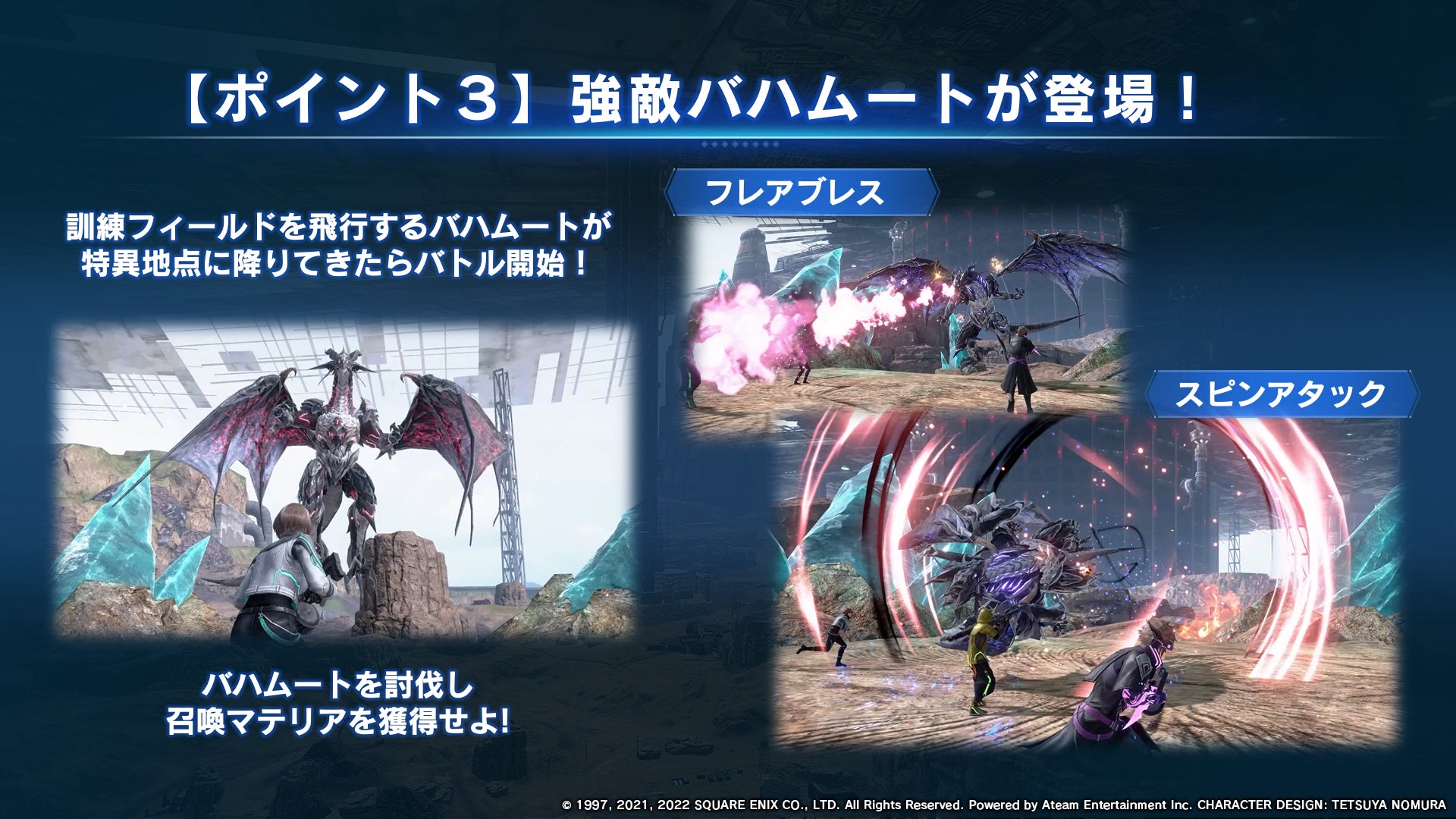 「特異地点」と呼ばれる対象地点にバハムートが降りてきたら、バトル開始!「フレアブレス」や「スピンアタック」などの攻撃を掻いくぐり、バハムートを討伐すると、召喚マテリア「バハムート」が獲得可能に!
