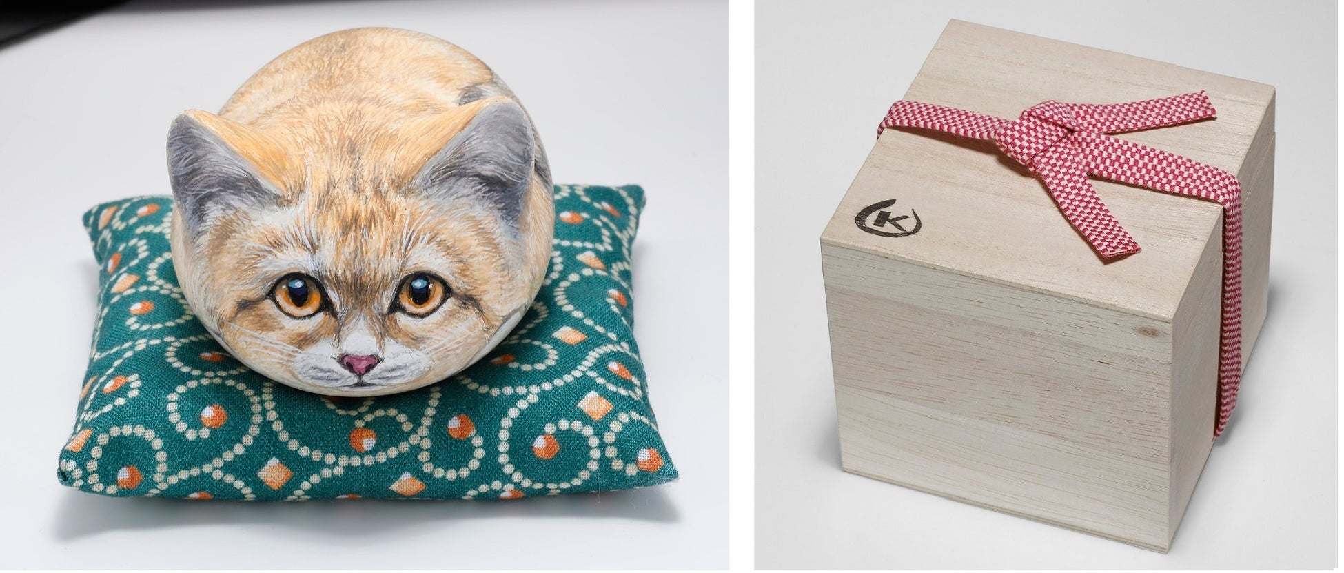 石(一部、耳や鼻を樹脂で成形している作品もあります)。座布団が付属(柄はランダム)。桐箱入り。日本製。※一点一点、手作り品のため、サイズや色合い、雰囲気が若干異なります。一点ものの作品としてご購入ください。※準備数を超えた場合、お届けまでに60日ほどかかる場合があります。