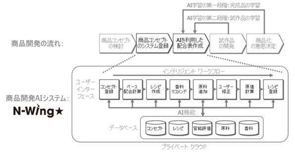 これまでサッポロビールのRTD新商品開発では、サプライヤーから得た原料情報を元に、過去のレシピ等を参照し、長年経験している開発者から情報収集も行うなど、時間と労力をかけて試行錯誤を繰り返して取り組んでいました。本システムは2021年11月よりテスト運用を開始(注2)し、本格実装に向けて協議・検証を続けてきましたが、このたび実装した「N-Wing★」は、これまで商品化した約170商品で検討した配合(約1,200種)や原料情報(約700種)を含むレシピを学習していて、新商品のコンセプトや必要な情報を入力すると、瞬時に目標とする配合の骨格をもとに原料の組合せ、各原料が商品全体の中に占める割合(配合量)まで予測し、推奨配合と推奨香料からなるレシピを出力します。開発担当者はこのレシピを参考にして必要な原料を調達し、試作品の開発を行います。「N-Wing★」が提示したレシピは、AIアルゴリズムにより人間では思い浮かばないような配合が創出されることが確認でき、今後も新しい原料・開発情報を繰り返し学習させることでレシピ配合の予測精度向上が期待されます。
