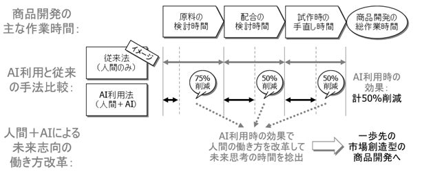 また、これまで初回の商品開発にかかる総時間のうち、原料や配合の検討に多くの時間を要していましたが、「N-Wing★」をテスト運用した結果、従来と比較して、原料検討時間は約75%削減、配合検討時間は約50%削減できることが確認できました。加えて「N-Wing★」の本格実装後、AIによる高精度なレシピ予測により試作時の手直し時間も約50%削減され、商品開発にかかる総時間が約50%削減される効果が期待できます。開発担当者は、これにより捻出された時間を新規原料・技術情報の探索や試験開発など、新たな活動に振り向け、一歩先をいく市場創造型の新商品開発に取り組むことができます。