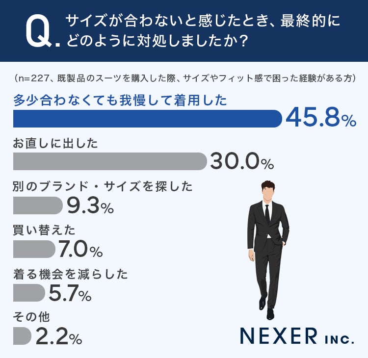 今回の調査では、既製品スーツを購入した人の約45%が、サイズやフィット感で困った経験があることがわかりました。そのうち約半数が「多少合わなくても我慢して着用している」と回答しており、既製品では理想どおりの着用感を得にくい実態がうかがえます。