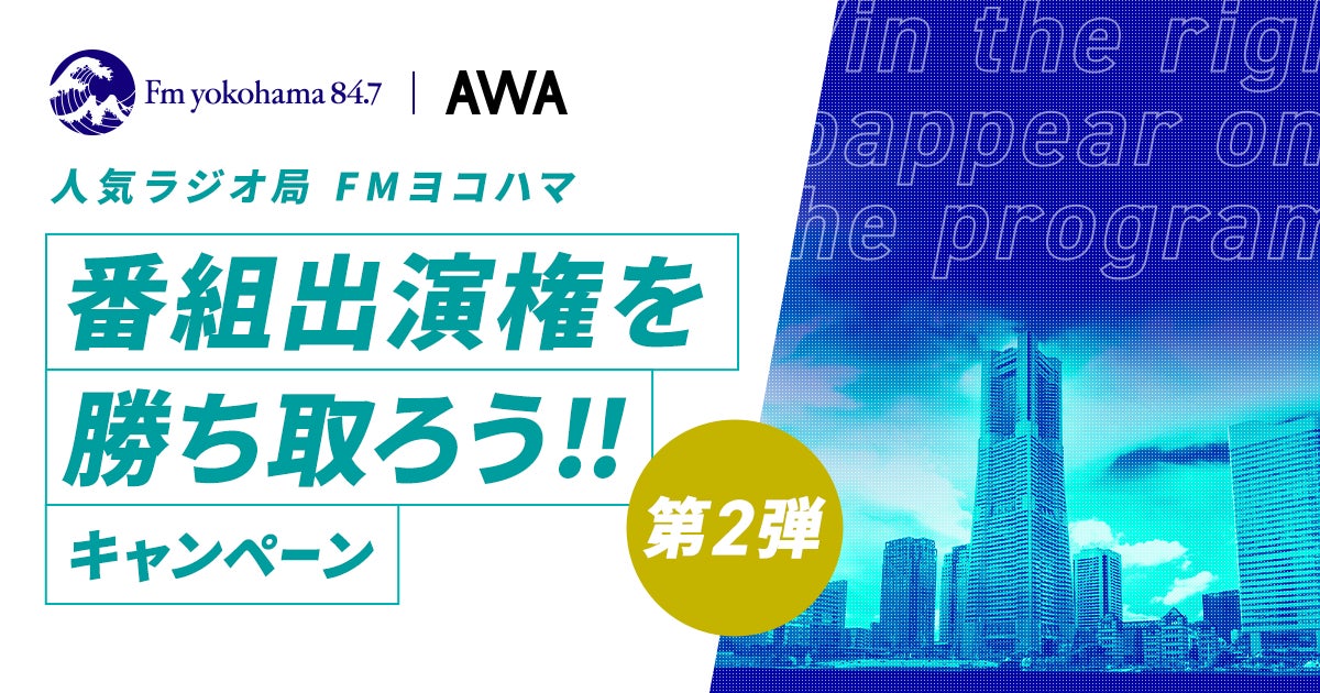 AWA株式会社(本社:東京都港区、代表取締役CEO:冨樫晃己)が運営する、サブスクリプション型(定額制)音楽ストリーミングサービス「AWA(アワ)」は、FMヨコハマで放送されるAWAコラボ番組への出演をかけた、『人気ラジオ局「FMヨコハマ」番組出演権を勝ち取ろうキャンペーン』の第二弾エントリーを開始いたしました。