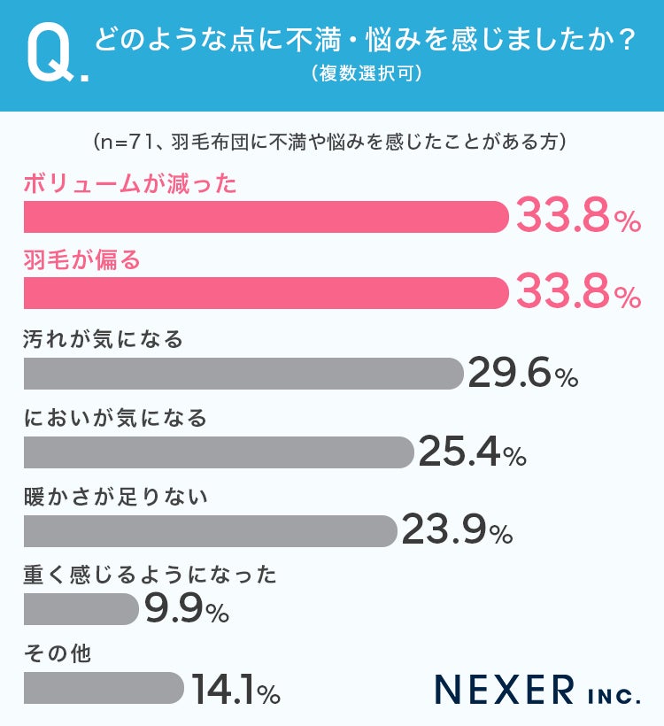 「ボリュームが減った」と「羽毛が偏る」が同率33.8%でトップでした。次いで「汚れが気になる」29.6%、「においが気になる」25.4%、「暖かさが足りない」23.9%と続きます。長年使用することで起こる劣化に関する不満が目立ちます。