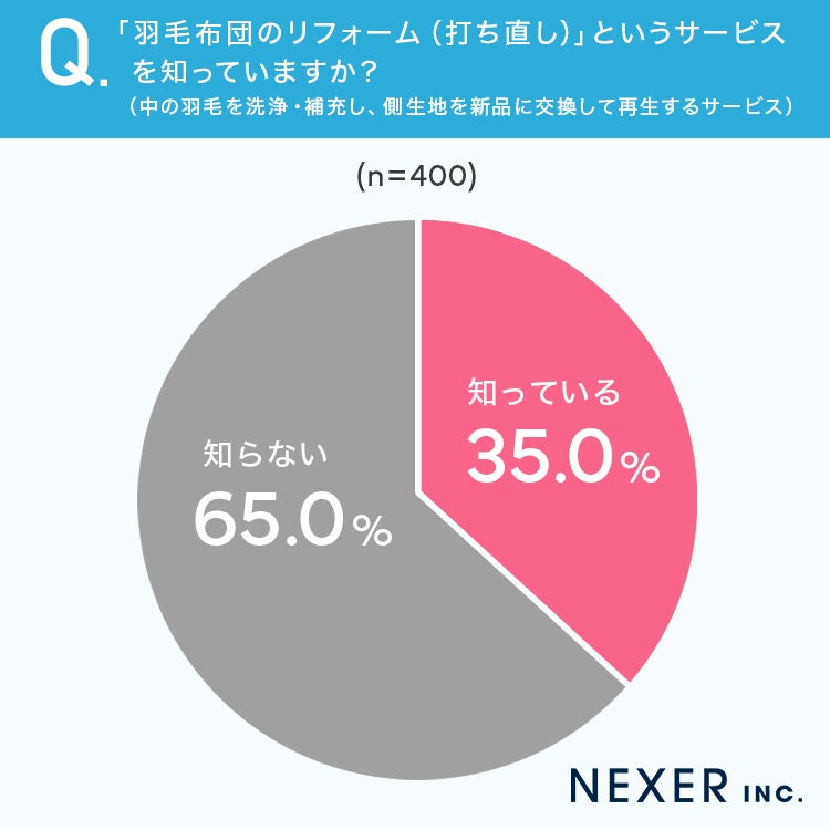 「知らない」が65%、「知っている」が35%という結果になりました。羽毛布団のリフォームとは、中の羽毛を洗浄・補充し、側生地を新品に交換して布団を再生するサービスです。約3分の2の人がこのサービスを知らないことが明らかになりました。