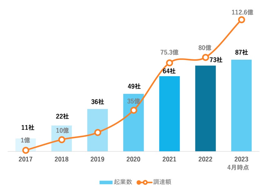最初の卒業生輩出(2016年9月)から7年半が経ち、2023年4月時点で87社が起業。資金調達総額はついに100億円を超え、112.6億円となりました。