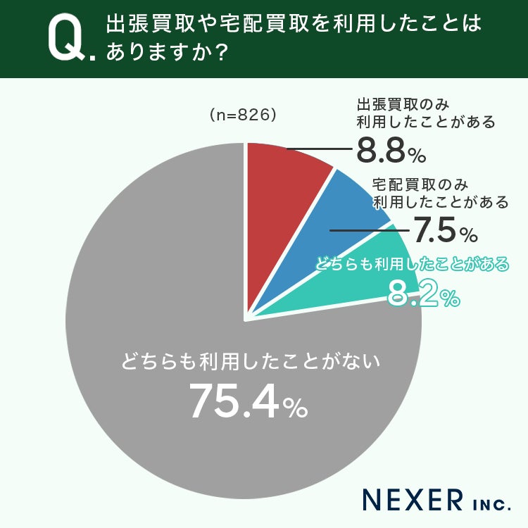 次いで「出張買取のみ利用したことがある」が8.8%、「宅配買取のみ利用したことがある」が7.5%、「どちらも利用したことがある」が8.2%となり、約4人に1人が何らかの買取方法を利用した経験がある結果となりました。