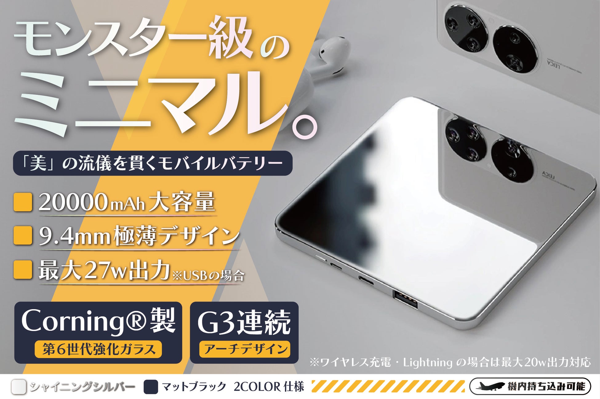 【機内持込み可/ワイヤレス充電/USB・Type-C・Lightning/高強度アルミ合金と強化ガラス採用】