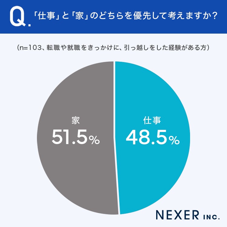 また、転職や就職をきっかけに引っ越しを経験した人は約2割でした。「仕事」と「家」のどちらを優先するかはほぼ半々で、考え方が分かれる結果となっています。