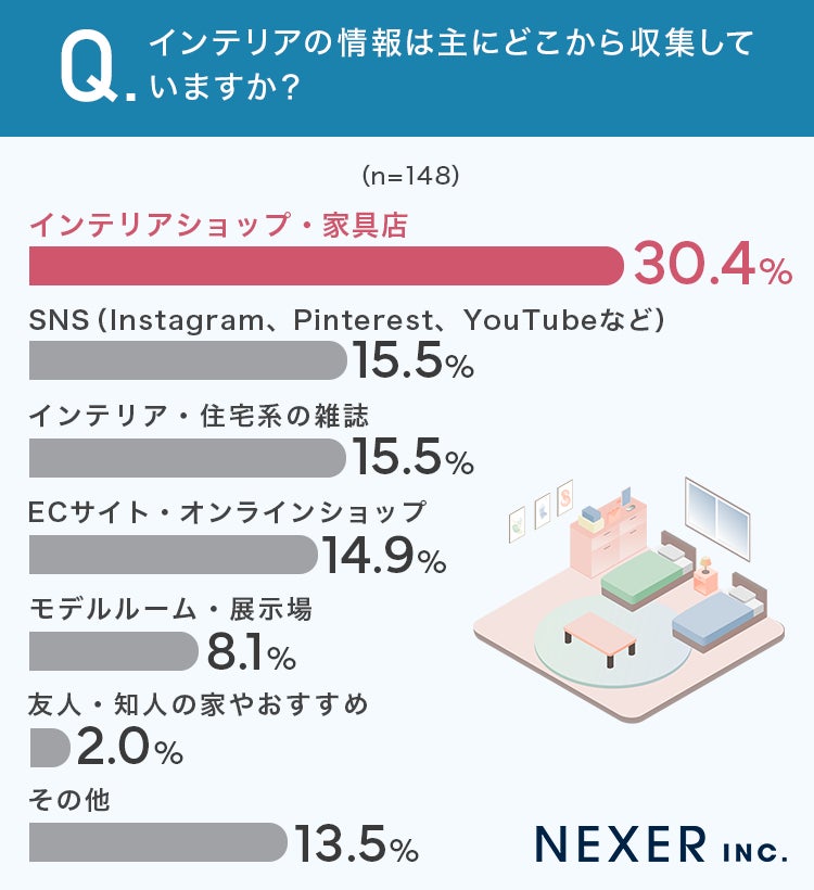 最も多かったのは「インテリアショップ・家具店」で30.4%でした。次いで「SNS(Instagram、Pinterest、YouTubeなど)」と「インテリア・住宅系の雑誌」がそれぞれ15.5%、「ECサイト・オンラインショップ」が14.9%と続きます。