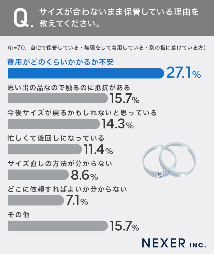 続いて、自宅で保管している・無理をして着用している・別の指に着けている方に、サイズが合わないままにしている理由を聞いてみました。
