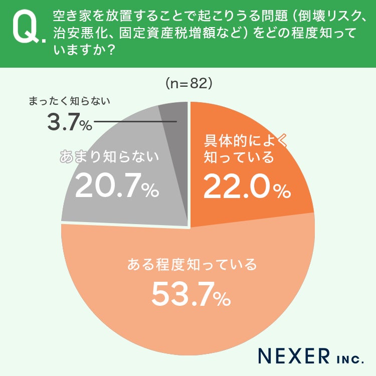 質問1:空き家を放置することで起こりうる問題(倒壊リスク、治安悪化、固定資産税増額など)をどの程度知っていますか?
