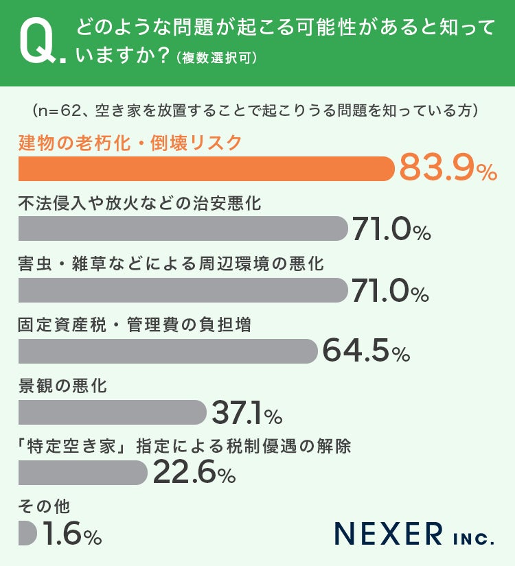 最も多かったのは「建物の老朽化・倒壊リスク」で83.9%でした。次いで「不法侵入や放火などの治安悪化」と「害虫・雑草などによる周辺環境の悪化」がともに71.0%、「固定資産税・管理費の負担増」が64.5%と続きました。