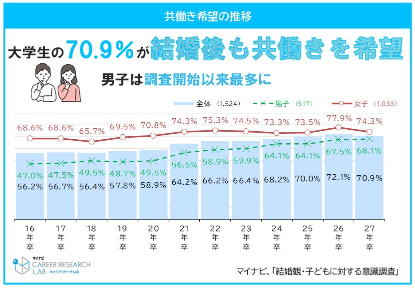 2027年3月卒業予定の学生に結婚後の仕事について聞くと、共働きを希望する割合は全体で70.9%(前年比1.2pt減)だった。男女別では、男子68.1%(前年比0.6pt増)、女子74.3%(前年比3.6pt減)で、男子は調査開始以来最高となった。また、男女の割合の差は6.2ptとなり、調査開始以来最も低い値だった。