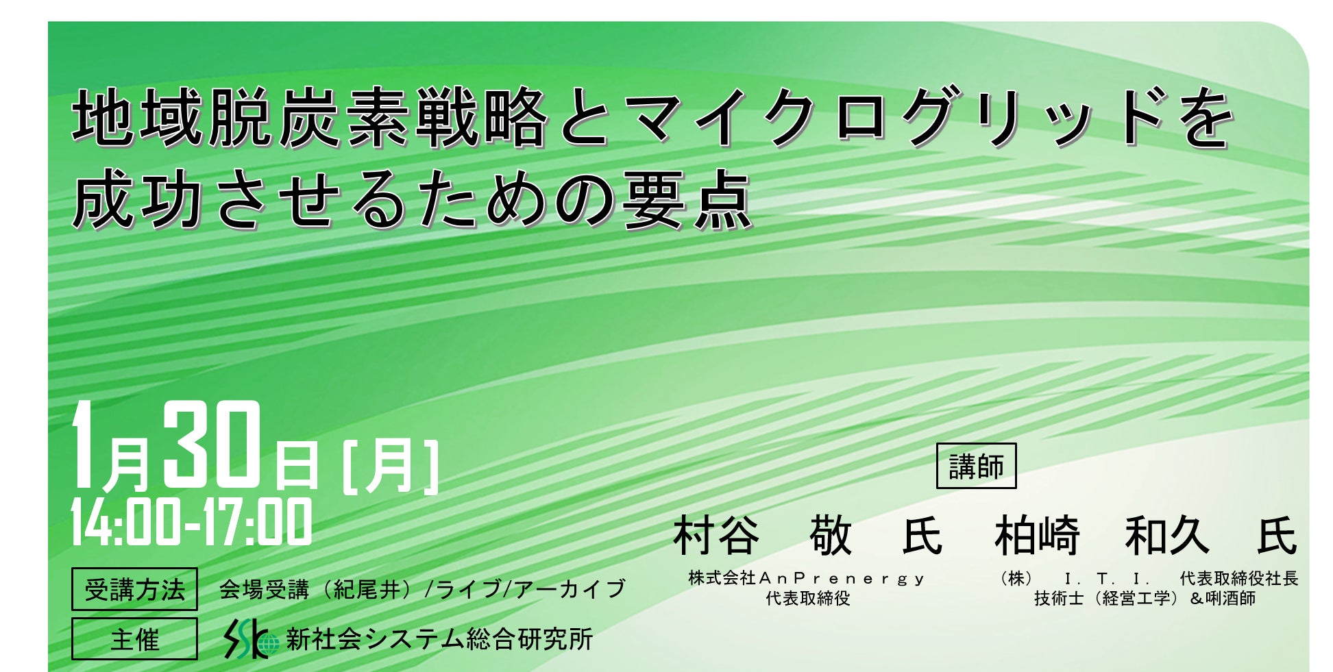 「地域脱炭素とマイクログリッドを成功させる要点」と題して、(株)AnPrenergy 村谷 敬氏/(株)I.T.I. 柏崎 和久氏のセミナーを2023年1月30日(月)に開催!!