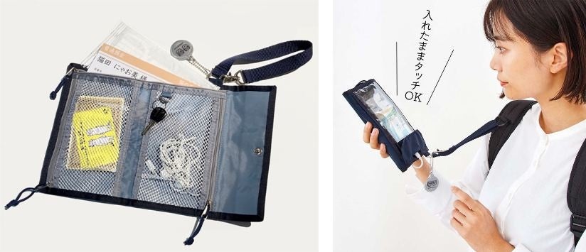 通帳やカード類、モバイルグッズ一式など、避難時に必要なものをまとめておけるポーチです。スマホポケットのフラップには、バッテリーなどのコードを通せる穴が付いているので、スマホを充電しながら持ち運びや操作もできます。旅行時の地図検索にも便利です。