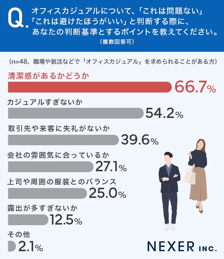 もっとも多かったのは「清潔感があるかどうか」で66.7%でした。続いて「カジュアルすぎないか」が54.2%、「取引先や来客に失礼がないか」が39.6%となっています。
