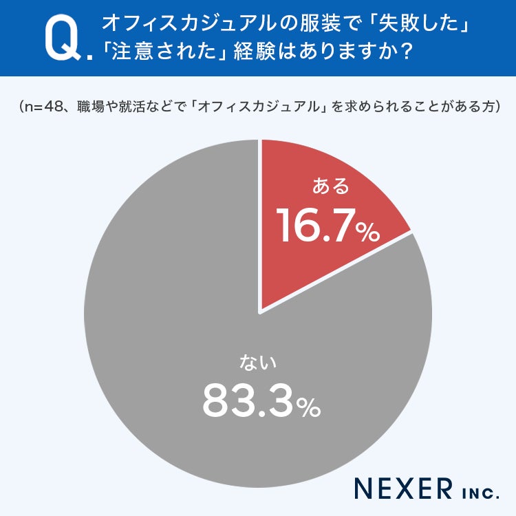 ■16.7%が、オフィスカジュアルの服装で「失敗した」「注意された」経験があると回答