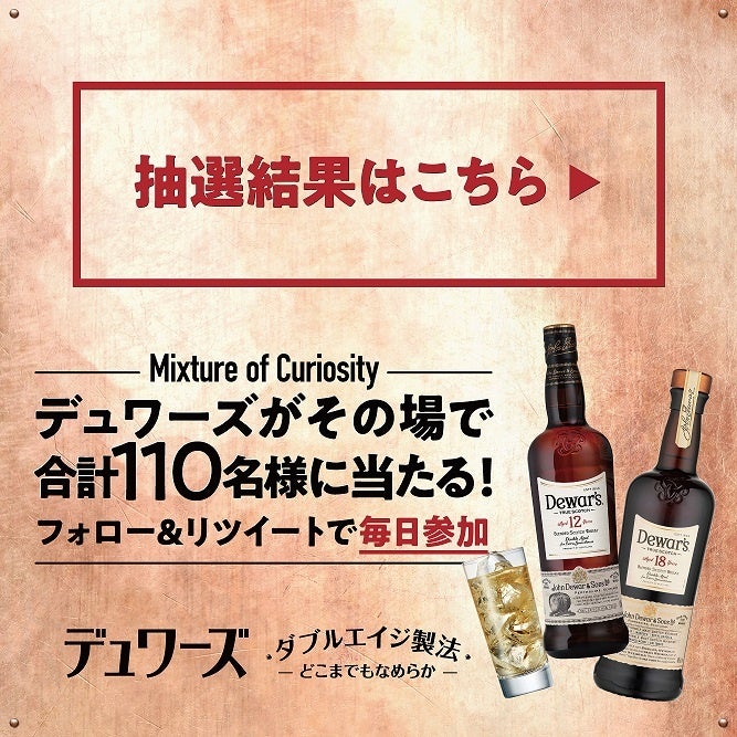 なお、本キャンペーンでは、Twitterフォロー&RTでデュワーズウイスキーがその場で当たるキャンペーンもスタートしています。期間は5月8日(日)まで。こちらもぜひご参加ください。