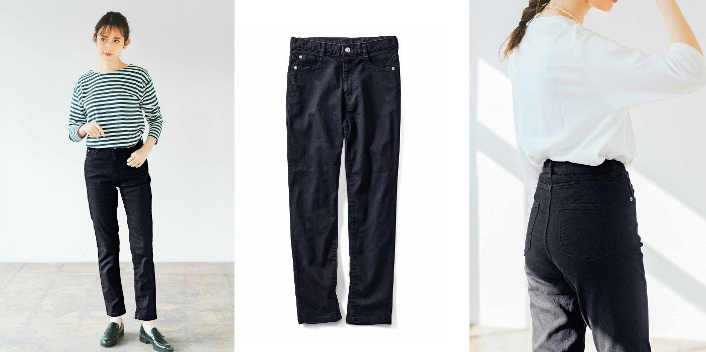 国産デニムの聖地、岡山県の職人さんがこだわりを詰め込んだ、大人のためのブラックデニムです。細身のテーパードシルエットで、こなれ感を出しつつすっきりきれいな印象になります。脚が細く長く見えるパターンへのこだわりと、ストレッチ性の高いやわらかなはき心地は、大人の女性にこそ愛用してほしい仕上がりです。