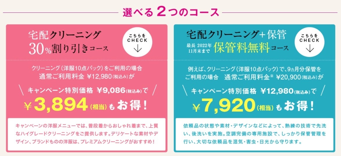 フェリシモのライフコンシェルジュが運営する宅配家事サポートサービス「カジサポ」は、宅配クリーニングサービスの春得キャンペーンを3月2日より実施しています。衣替えを応援するキャンペーンで、通常利用料金が30%割り引きで、仕上がり次第返却コースと、宅配クリーニング&最長2022年11月末まで無料保管・ご希望日時に返却コースのふたつから選べます。詳細は、カジサポのキャンペーンサイトでチェックできます。