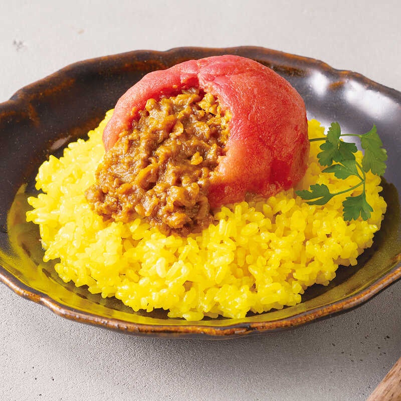岐阜県美濃白川の肉厚な完熟トマトの中にはキーマカレーが!飛騨の豚肉と国産野菜をじっくり炒めたカレーの甘みとトマトのみずみずしさがベストマッチ。チーズ入りは濃厚&まろやかな味わい。2023年度「バイヤーズルーム経済産業大臣賞」受賞。