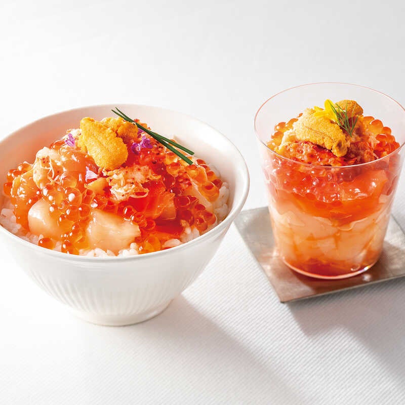 濃厚な味わいの花咲がにや、クリーミーな蝦夷ばふんうにのほか、醤油たれで漬け込んだカムイサーモン、秋鮭からとれたいくら、シンプルな塩味の帆立といった贅沢な味わいを、目にも美しいミルフィーユ仕立てに。