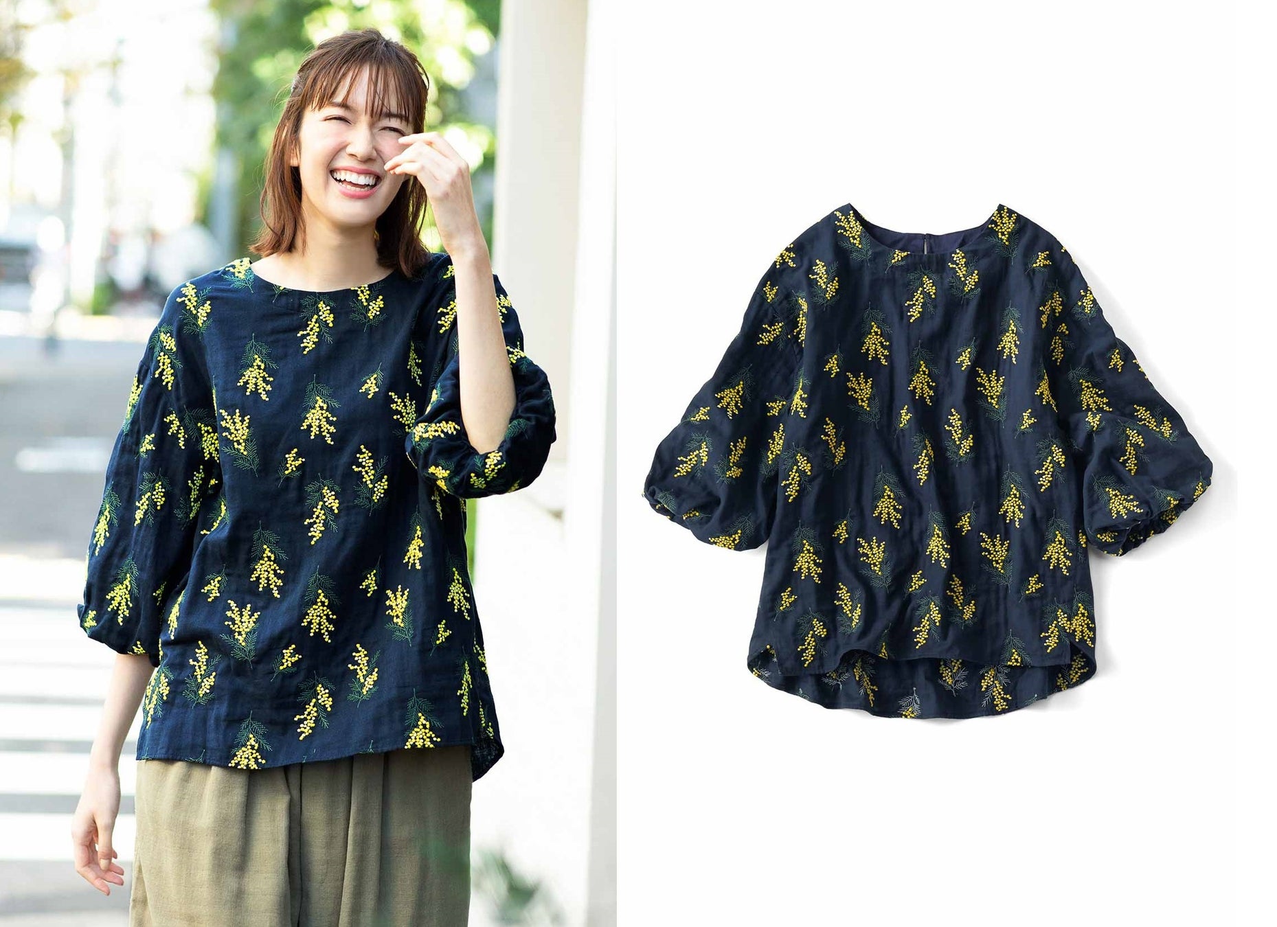 やわらかなダブルガーゼにミモザの刺しゅうが咲きほこる、春爛漫なトップスです。ふんわり軽い着心地で、ボディーラインを拾わないゆとりのあるシルエットが特徴です。かわいいけれど、ベースがネイビーだから甘くなりすぎず、大人っぽい華やかさを演出できます。