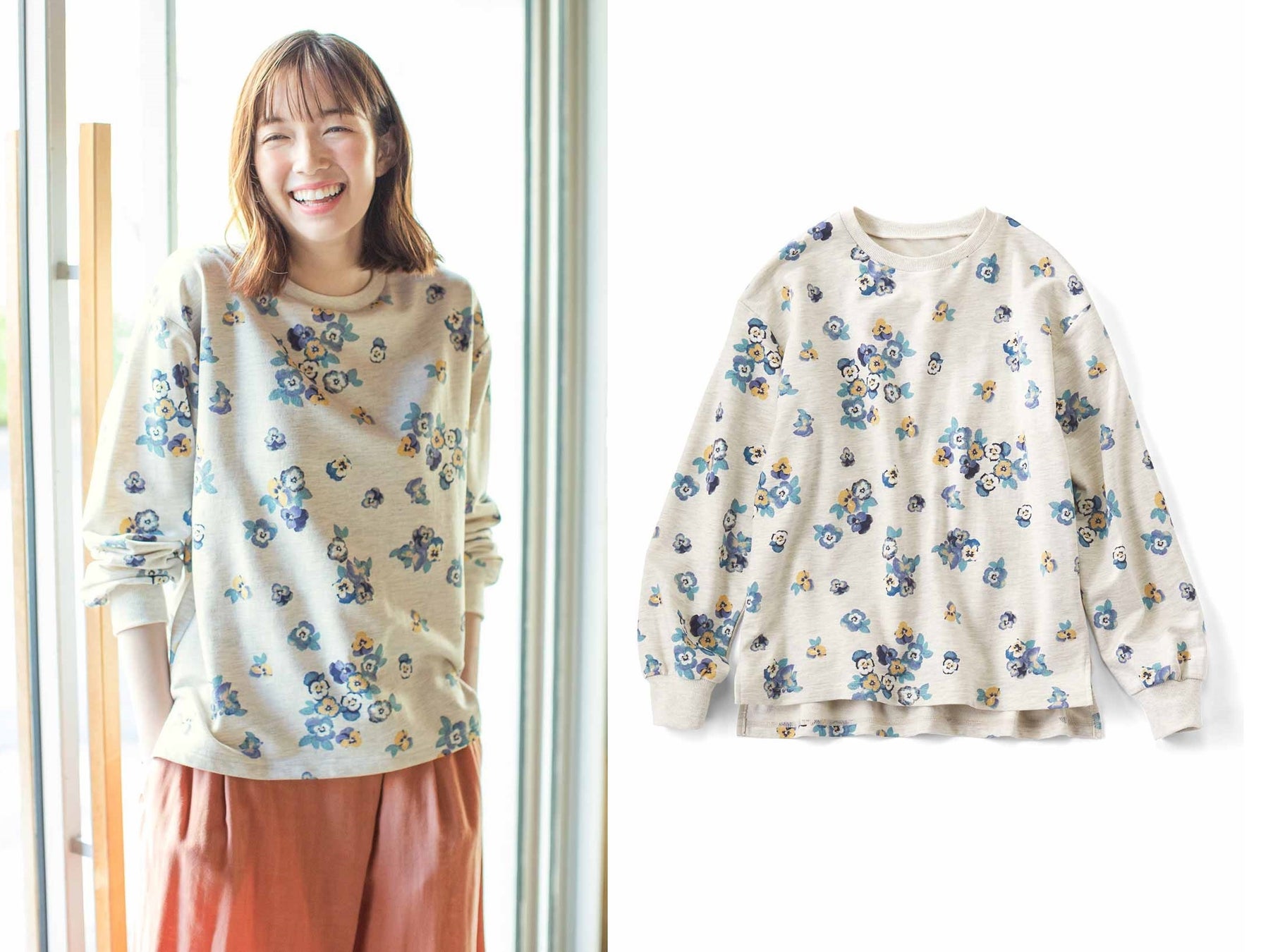 色合いがパッと鮮やかなパンジー柄のミニ裏毛トレーナーです。春先ははおりの中からのぞかせて、春本番は一枚でちょうどいい素材感になっています。ふんわりとしたスカートとの相性がよく、デニムにさらっと合わせるだけでフレッシュな着こなしになります。