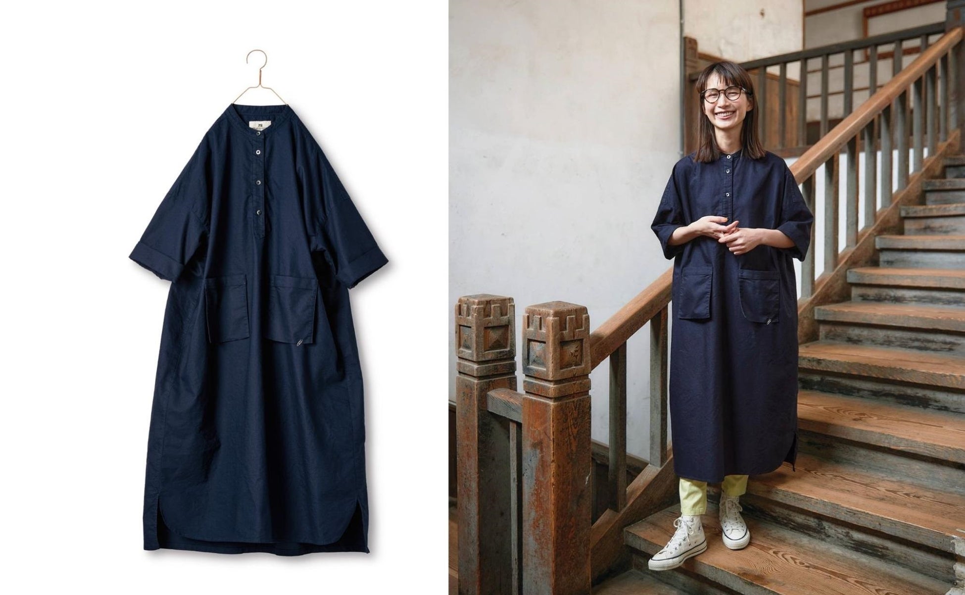 新作の「方眼紙ワンピース」は方眼紙のマス目を、できるだけ正方形になるよう打ち込み本数を調整し、チェック柄にした生地で仕立てたアイテムです。ゆったりとしたドロップショルダーデザインで、袖口はタックを入れた立体的なシルエットに仕上げています。