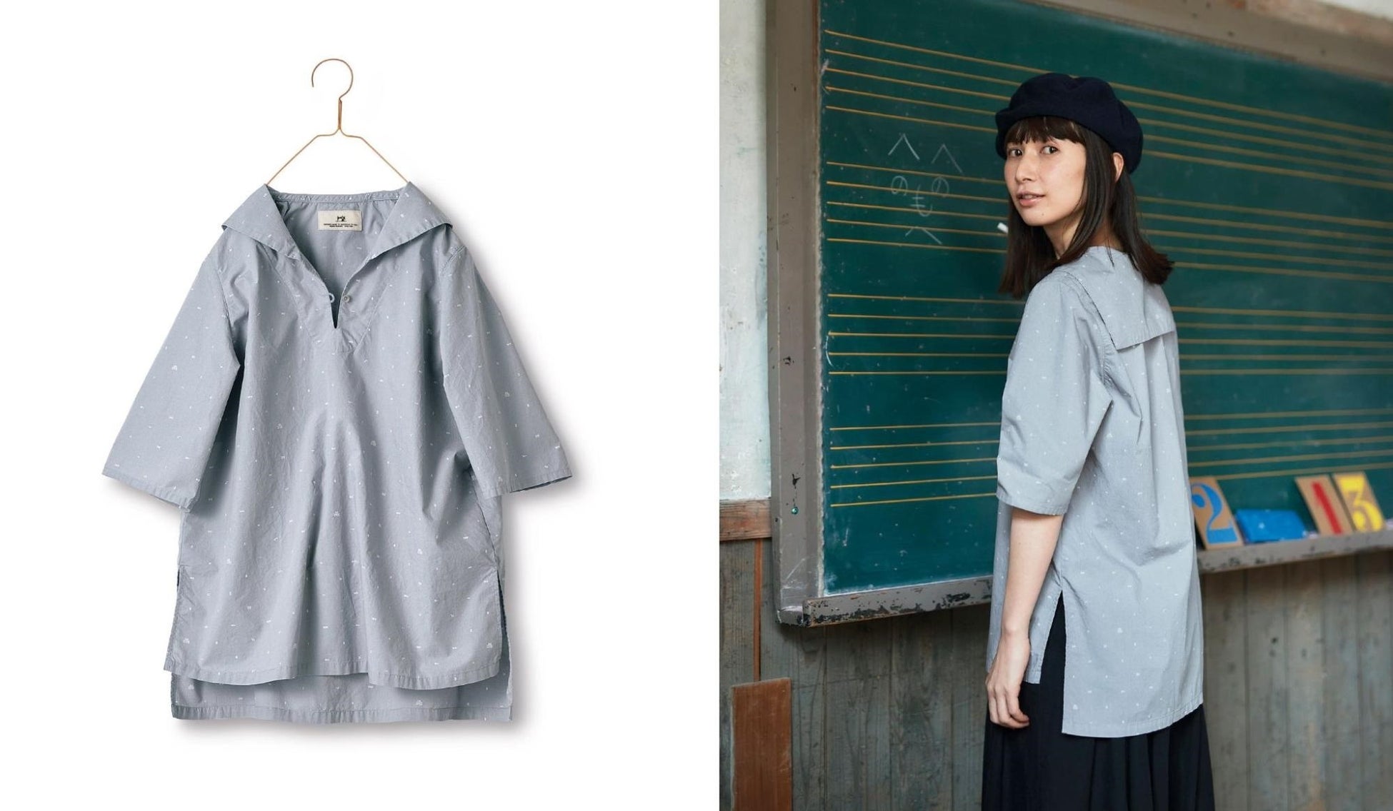 電卓のボタンに書かれている数字や記号などを散りばめたセーラーシャツとメンズシャツです。ベース生地をグレー、文字を白にすることで、子どもっぽくなりすぎない落ち着いた雰囲気に。高密度のさらりとした風合いの生地も、電卓の質感からイメージしたものを採用しています。