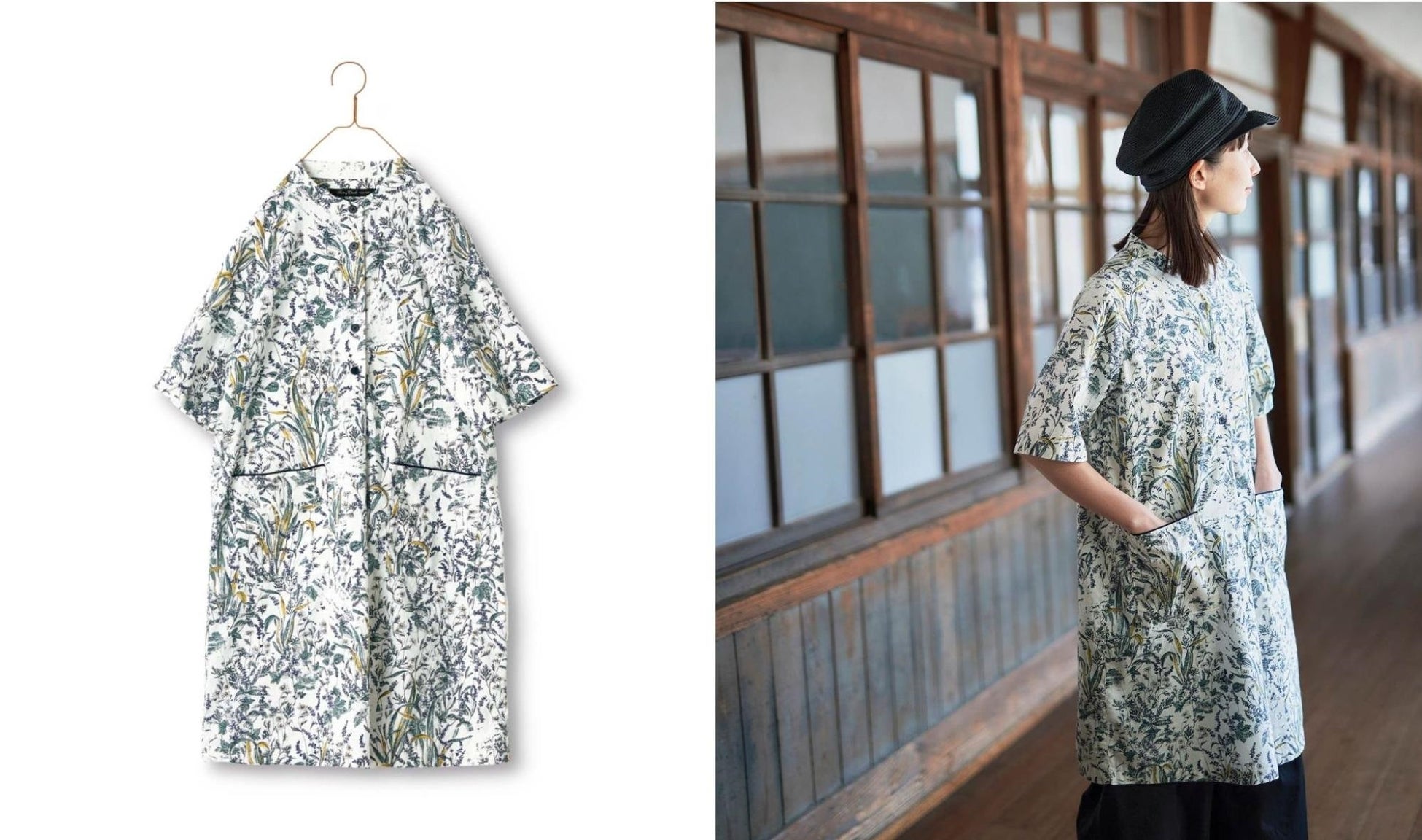 綿100%の生地で仕立てたワンピースです。ところどころ薄く消えている花柄は、実際に消しゴムで消しながら描いたオリジナルのパターンで、カモミール・レモンバーム・マロウ・ペパーミント・ラベンダー・レモングラスの計6種類のボタニカルたちがさわやかな印象のワンピースです。