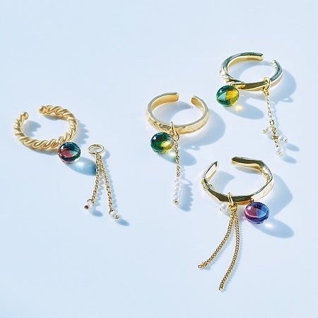 2色を合わせて仕上げたガラスは、それぞれが微妙に違う世界にひとつだけのものです。イヤカフ単品でシンプルに仕上げたり、チェーンでゆらゆらと動きを出して華やいだ耳もとを演出したり、コーデやその日の気分に合わせて違った雰囲気を楽しめます。4種類全部集めて自由に組み合わせるのもおすすめです。