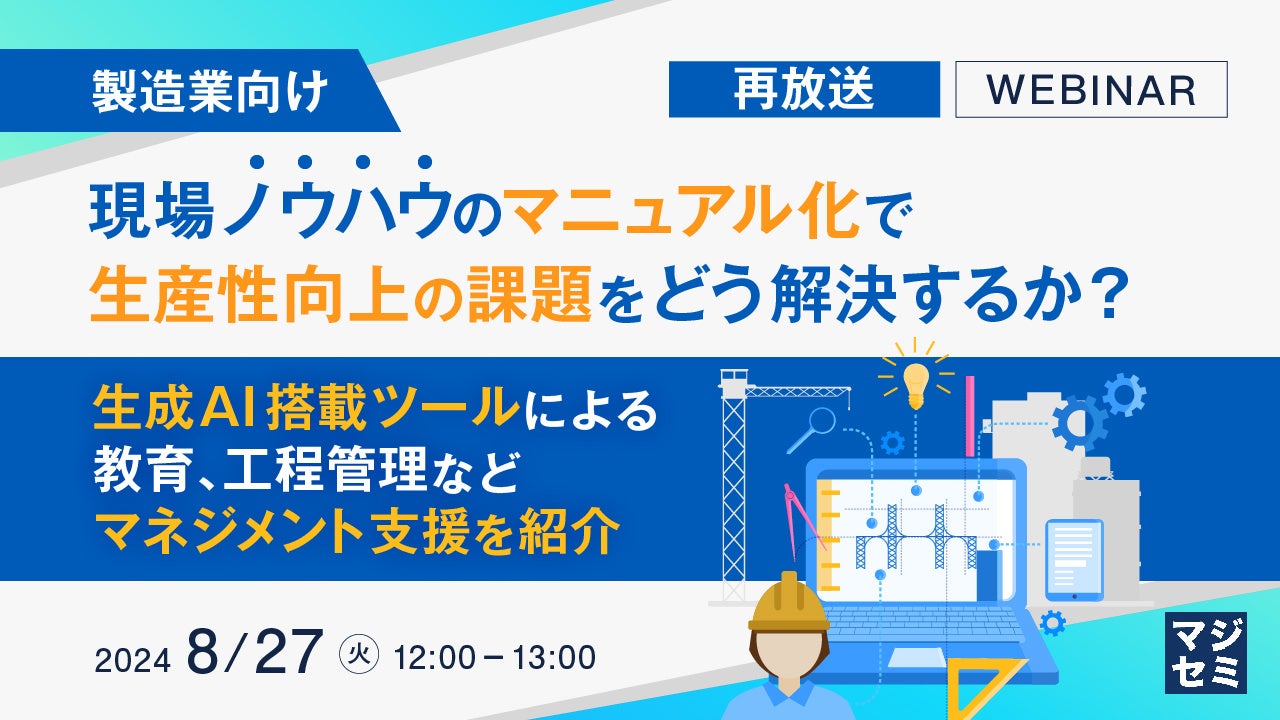 マジセミ株式会社は、大変好評をいただいた「【再放送】【製造業向け】現場ノウハウのマニュアル化で、生産性向上の課題をどう解決するか?」というテーマのウェビナーを再放送します。