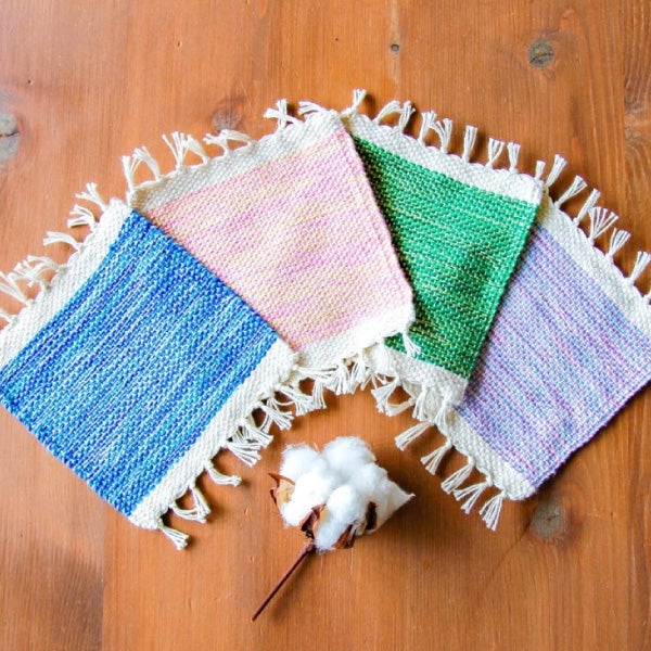お土産・プレゼント、夏休みの思い出作りに。機織り機を使用してコースター作りを体験していただきます。24色の糸から3色を選び、自分好みのコースターを1枚織り上げます。