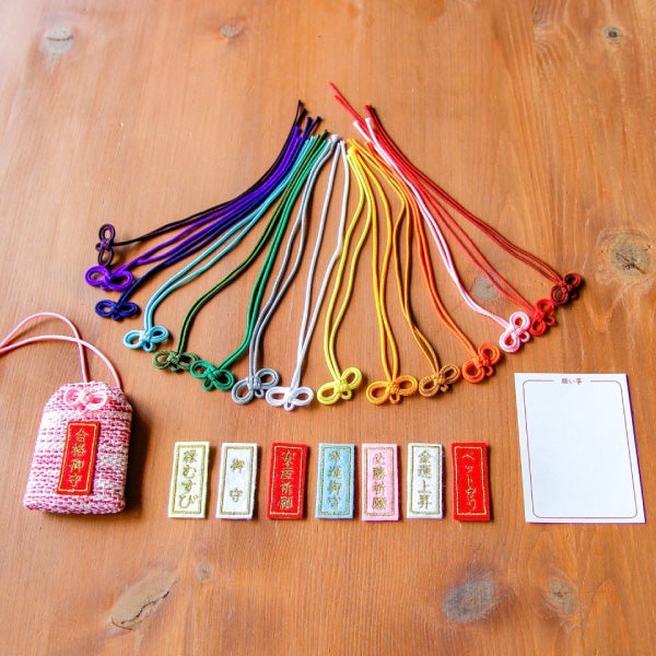 世界にひとつ、あなただけのお守りを作ってみませんか?お守り袋、紐、願いごとワッペンを選び、願いごとを書いた紙を入れて、紐を通して完成!