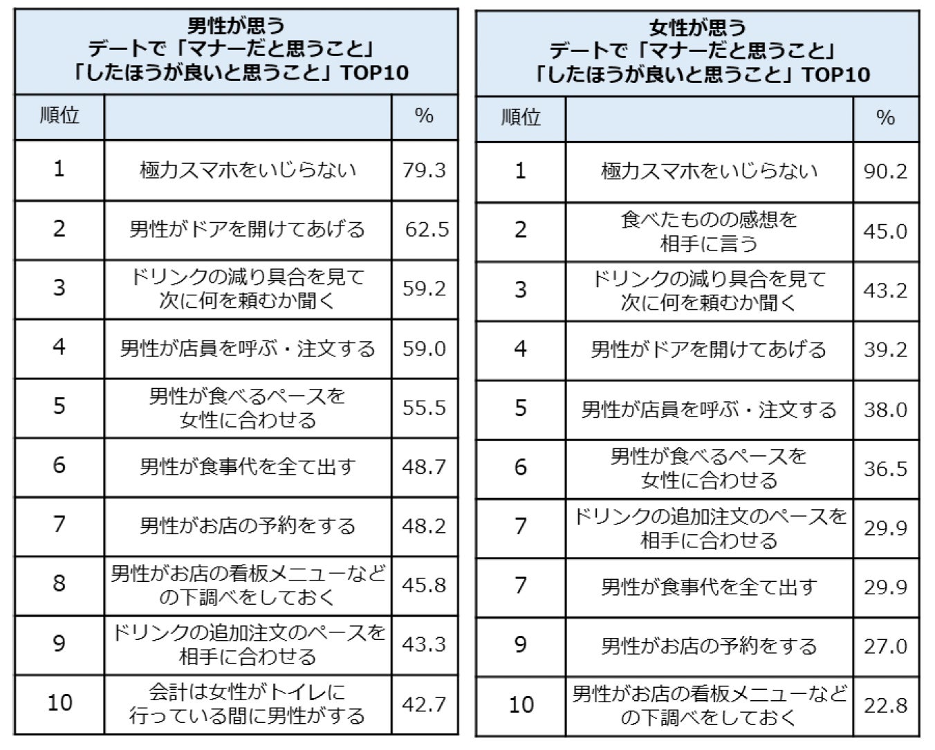 ※提示した項目:男性がお店の予約をする、男性がドアを開けてあげる、女性は上座に座ってもらう、女性の上着を掛けてあげる、男性がお店の看板メニューなどの下調べをしておく、男性が店員を呼ぶ・注文する、男性が食べるペースを女性に合わせる、食べたものの感想を相手に言う、ドリンクの追加注文のペースを相手に合わせる、ドリンクの減り具合を見て次に何を頼むか聞く、極力スマホをいじらない、食事が終わった後に男性が女性にトイレに行くよう促す、会計前に女性はトイレに行く、会計は女性がトイレに行っている間に男性がする、男性が食事代を全て出す