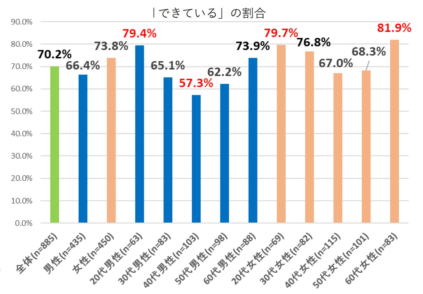 飲食店での初デートなど、気心知れたというわけではない相手とのデートで相手への気遣いや振る舞いができているか?という質問で、全体では「できている」が70.2%でした。特に男性は20代(79.4%)が最も高く、次いで60代(73.9%)という結果に。女性は60代(81.9%)が最も高く、次いで20代(79.7%)でした。また、最も低かったのは男女ともに40代という結果になりました。